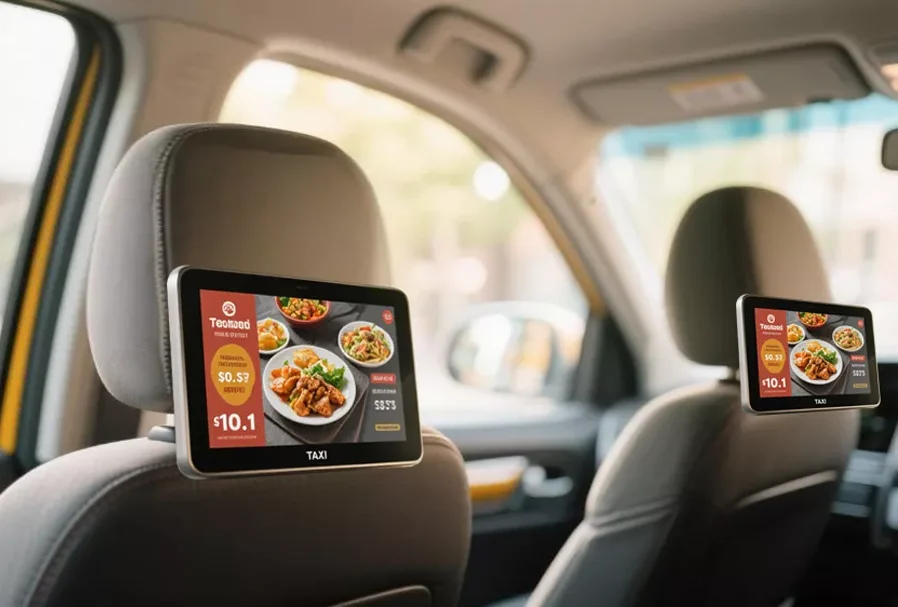 Telas digitais instaladas no banco traseiro de carros de aplicativo e táxis. O passageiro vê sua marca durante todo o trajeto.